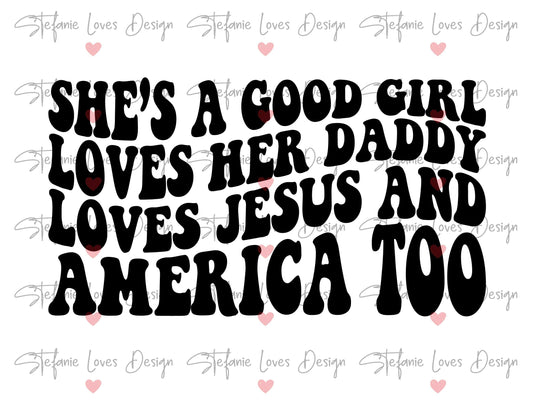She's A Good Girl Loves Her Daddy Loves Jesus and America Too svg, wavy letters, Digital Design