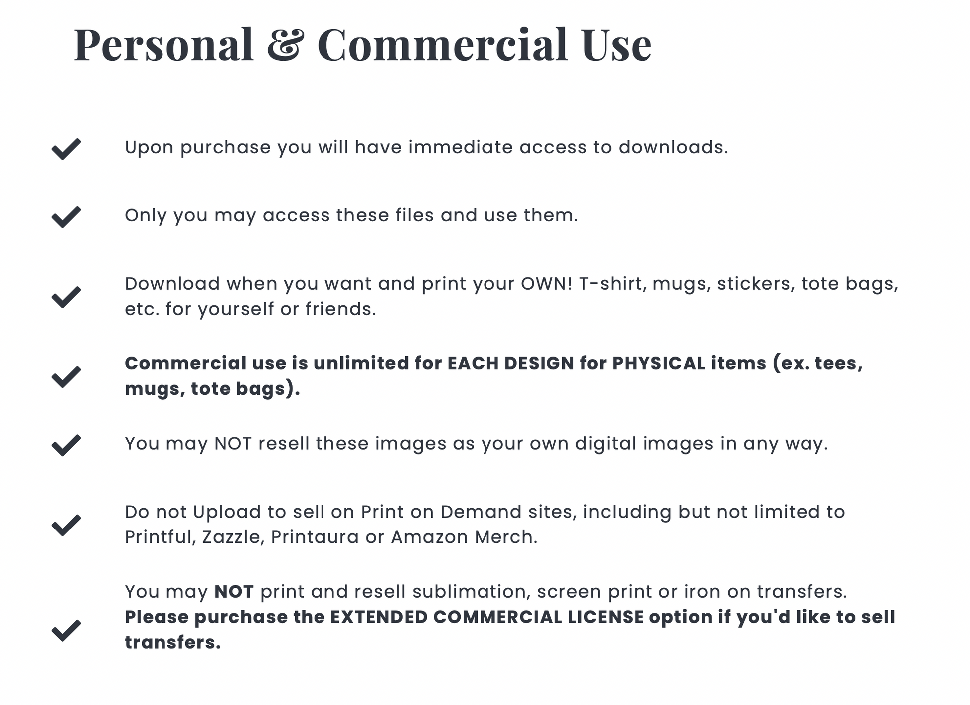 🟩 The Extended Commercial Use License includes ALL of the above AND the printing and selling of transfers.